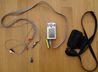 É um aparelho para o exame (ao coração) que dá pelo nome de Holter (suponho, mas não garanto, que seja o nome do "inventor"). O técnico coloca aquelas coisinhas no corpo em locais estratégicos, e as coisinhas estão ligadas ao aparelho propriamente dito, que regista o trabalho do músculo do amor durante aproximadamente 24 horas. Não dói nada, mas é uma grande chatice fazer este exame, por causa do "trambolho" que fica preso à cintura ou ao peito (com a bolsa colocada tipo mala).
