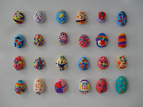 O material utilizado foi a fantástica Plasticina Jumpingclay (se tem curiosidade sobre a Jumpingclay, veja este vídeo). Misturámos duas cores (branco + a cor que cada um escolheu) para a base do ovo e a seguir cada um enfeitou como conseguiu ou achou melhor.
