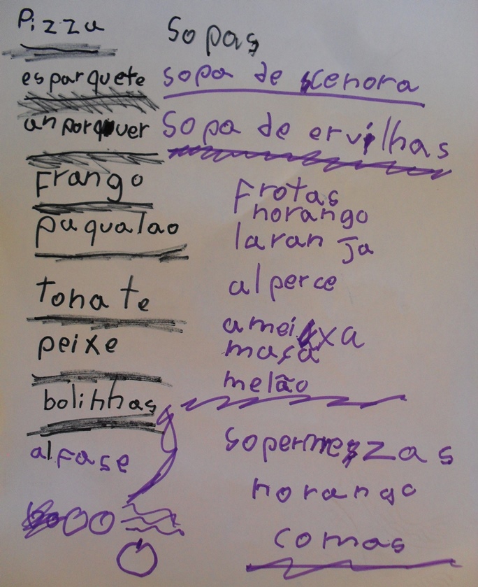 A Vassoura e a Varinha estiveram a brincar aos hóteis. A Vassoura fez uma lista de comidas, ou seja, o nénu (agora já diz menú!) para o restaurante do hotel. Ei-lo: