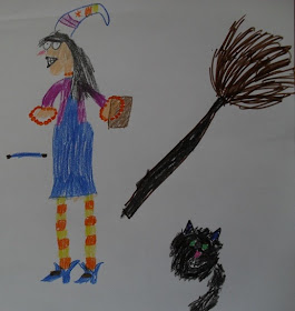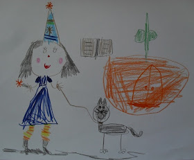 Pedi à Vassoura e à Varinha para desenharem a Bruxa Mimi, o gato Rogério, a vassoura voadora, a varinha mágica e o livro de feitiços. A minha ideia era aproveitar os desenhos delas para criar um cabeçalho diferente aqui no blogue. Não sei se isso vai acontecer, mas os desenhos ficam desde já registados para a posteridade...