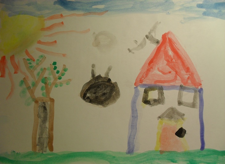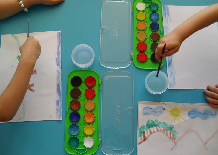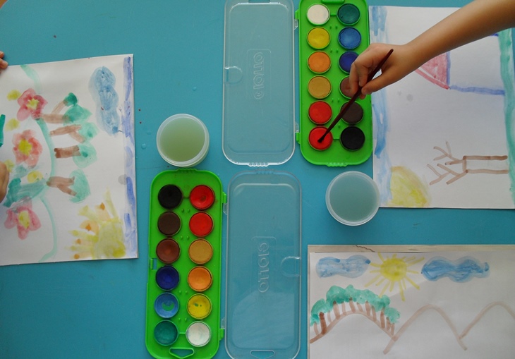 | Primeiras pinceladas: Vassoura à esquerda, Varinha à direita. No canto inferior direito está uma pintura parcial que fiz para dar algumas dicas sobre como pintar com aguarelas. |
