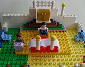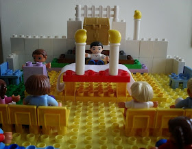 Depois da igreja que a Varinha construiu, há tempos, com a minha ajuda, o Feitiço pediu-me ajuda para construir uma igreja (a bem da verdade, ele pediu-me foi para o ajudar a construir uma "Missa"). Anteontem, como vos disse, fizemos o chão. Ontem, fizemos o resto. O resultado foi este:
