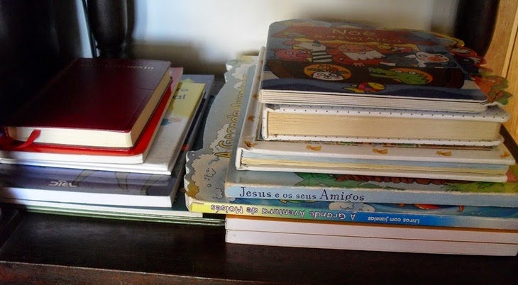 A mesa tem uma prateleira e uma gaveta. Na prateleira colocámos alguns dos livros para crianças que estão relacionados com histórias da Bíblia ou com a oração. Também lá estão os livros "Os Mistérios da Fé" (volumes 1 e 2 - ainda não temos o nº 3).