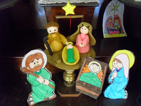 Amanhã é o dia da Sagrada Família. No nosso Canto de Oração não houve muita alteração durante o Advento, mas houve a multiplicação das Sagradas Famílias. Além da que foi feita em JumpingClay, e que faz parte do Canto de Oração desde o início, há uma que a Varinha pintou e colou em cartão (na escola), e outra que é apenas um desenho que o Feitiço pintou (ao fundo, do lado direito). Espero sinceramente que saibamos viver de forma mais dinâmica os vários tempos litúrgicos que existem ao longo do ano.