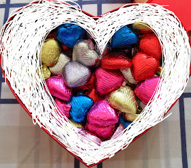 Acho que se percebe o que é: uma caixa em forma de coração, cheia de chocolatinhos em forma de coração. Uma prenda que acabou por ser para toda a família, porque o Rogério é generoso e eu (nós) não sou (somos) a(s) única(s) pessoa(s) que gosta(mos) de chocolates cá em casa...