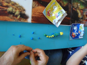 Ao chegar a casa, ele quis logo utilizar a plasticina para fazer um dinossauro. Escolheu este,