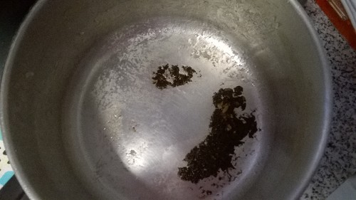 O tacho com arroz queimado, depois de uma noite cheio de água, sem ter sido esfregado, estava assim: